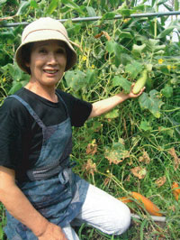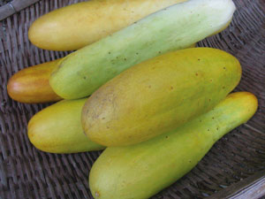一見ウリのようなこの山のきゅうり、ぱりぱりと歯ごたえよく、味もあっさりして青臭みがありません。子どもたちも大好きな夏野菜のひとつです。子どもたちは豪快に味噌を付けてそのまま食べるのがお気に入り。こんなふうにそのままでも食べられますし、縦割りにして種を取ってスライスし、酢の物にするととってもおいしい! 柚子酢(柚子しぼり)がばっちりあいます! 今の時期ならそれに青じそを刻んで入れるとちょっと香り高い酢の物グレードアップ!タマネギのスライスなんかもよくあいますよ〜。