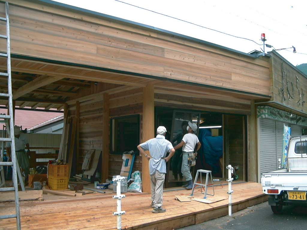 8月7日ほぼ完成! 店部分にサッシをはめております。半分はオープン奈デッキスタイルで座って休んでいってもらえるようになっています! |